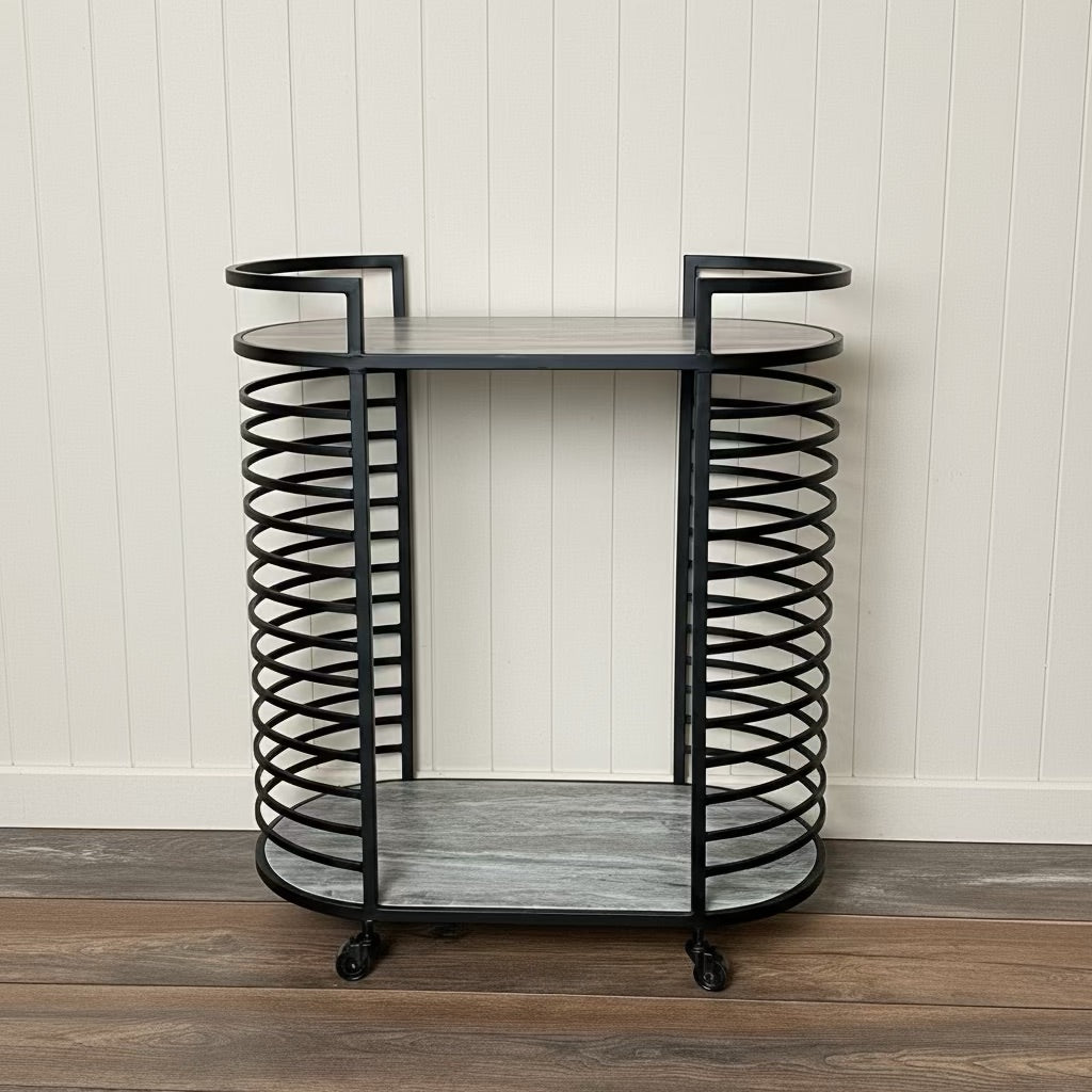 Featuring a modern matt black metal curved frame with two generous shelves, each offering ample space to store your barware essentials. Each shelf has soft muted tones of taupe and off white with pale grey veins creating a subtle marble effect. Four matt black wheels ensure smooth and easy manoeuvring when required.