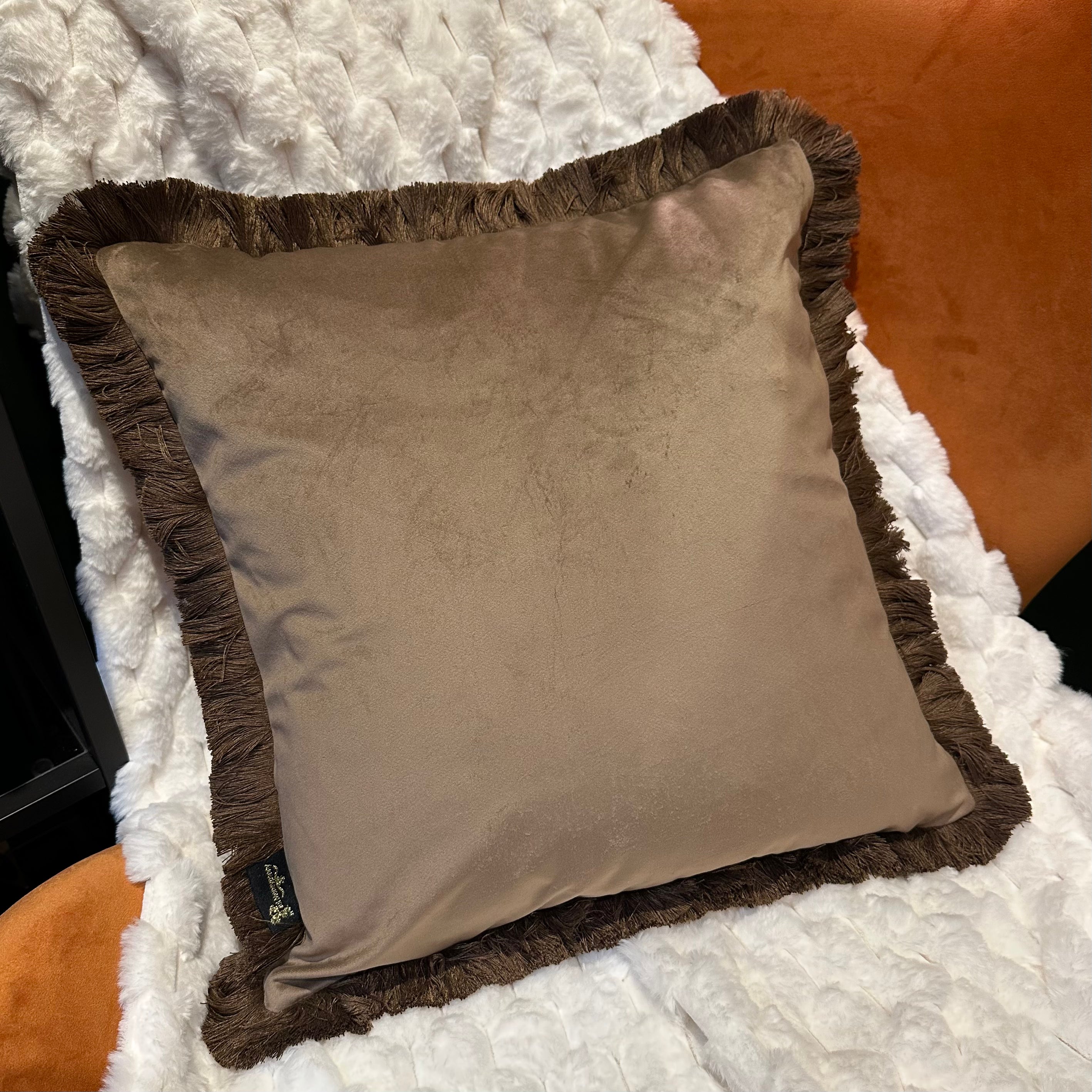 The stylish burnt orange and brown animal print design is featured on the front of the cushion while the back is soft brown plain velvet. There is a soft fringe around the edge of this cushion which frames the pattern beautifully, a concealed zip enables the cover to be removed for washing.