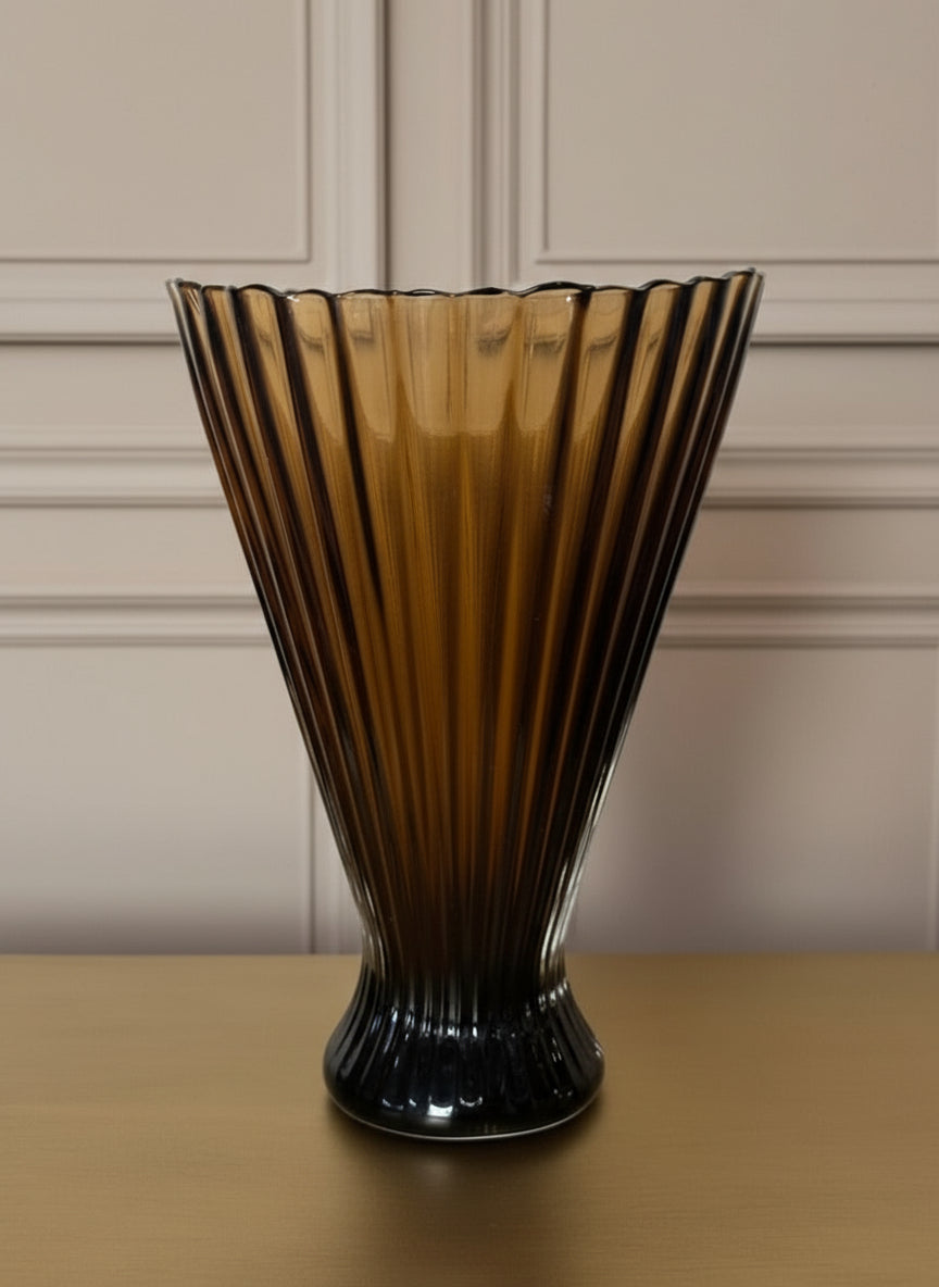 A gloriously shaped glass vase in rich brown tones with a stylish pleated design.